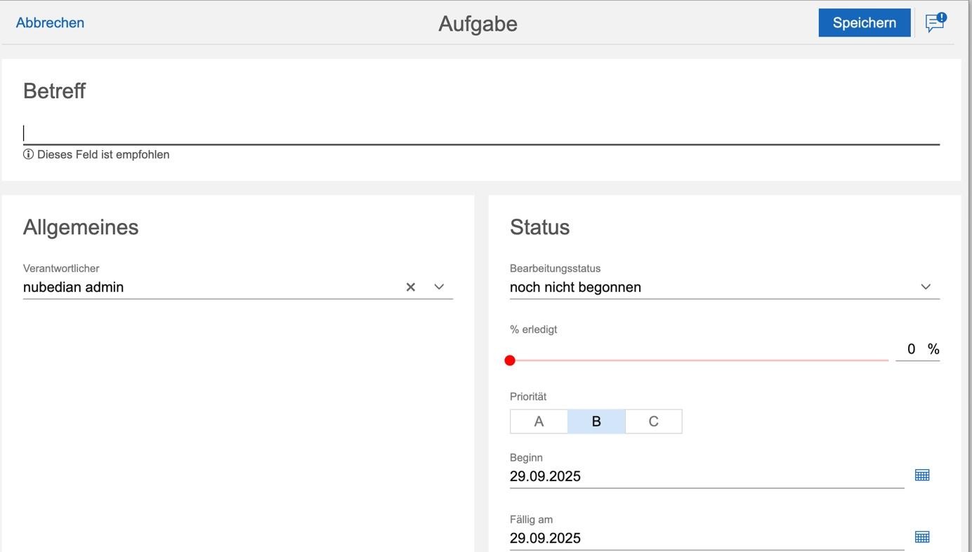 Dabei geben Sie den Betreff der Aufgabe ein und – falls gewünscht – die verantwortliche Person.