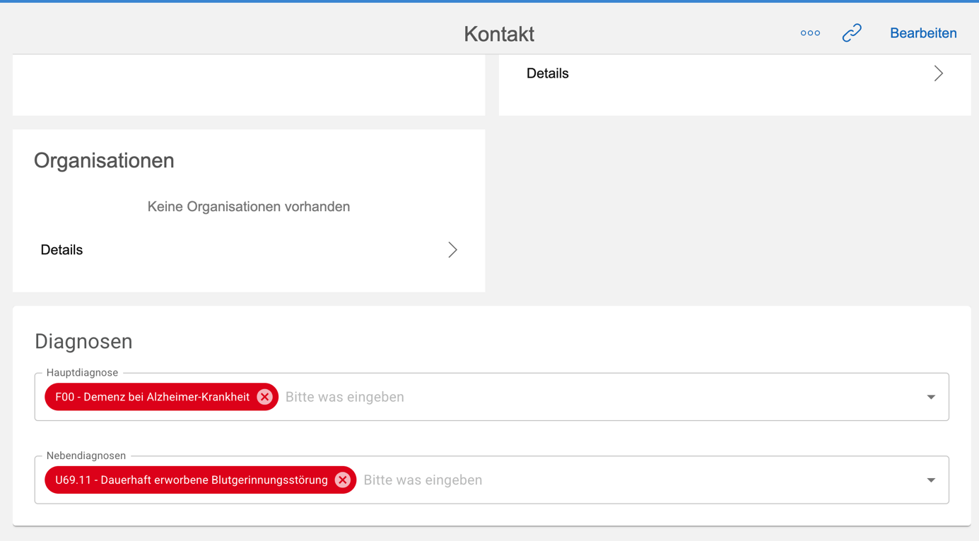 Wenn Ihnen bereits Diagnosen bekannt sind, können Sie diese im Kontakt hinterlegen. Scrollen Sie dazu im Kontakt nach unten zum Feld Diagnosen. Dort können Sie sowohl die Hauptdiagnose als auch Nebendiagnosen eintragen.