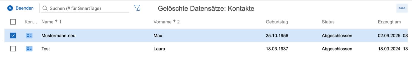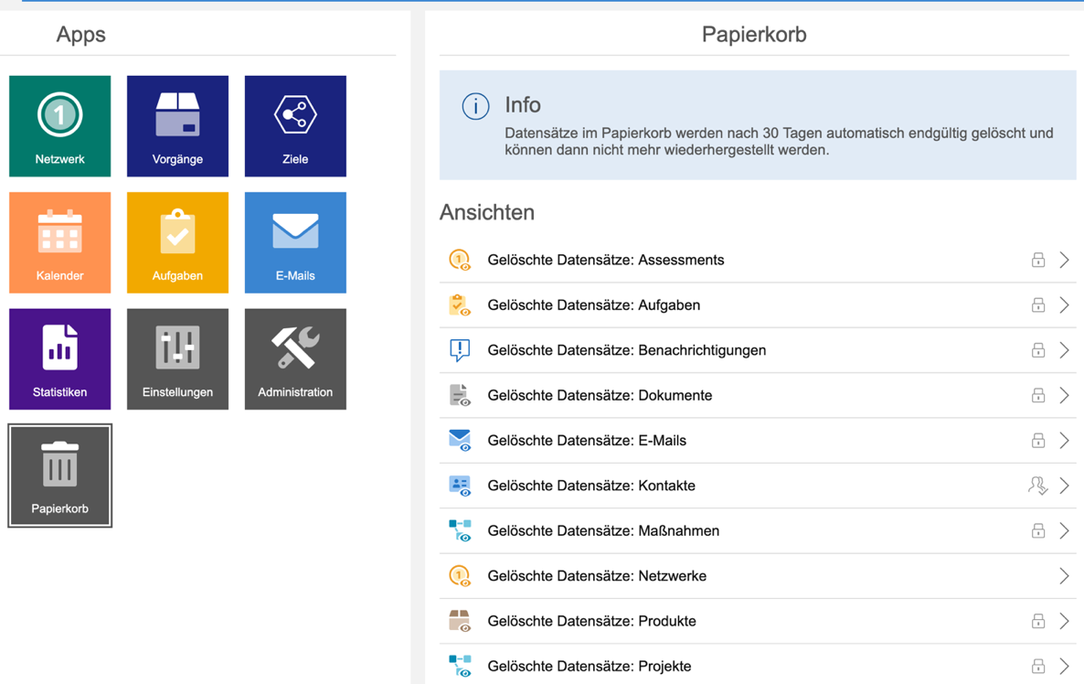 Wichtig: Die Datensätze im Papierkorb werden nach 30 Tagen automatisch gelöscht und können dann nicht mehr wiederhergestellt werden. Wenn Sie einen Datensatz wiederherstellen möchten, öffnen Sie die gewünschte Ansicht und setzen links ein Häkchen im entsprechenden Kästchen.