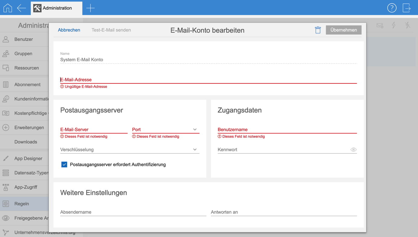 Öffnen Sie die App Administration und klicken unten auf den Bereich „Regeln“. Nun klicken Sie oben rechts auf Mailserver konfigurieren (). Sobald Sie den Mailserver konfiguriert haben, erfolgt nun die Aktivierung der Regeln.
