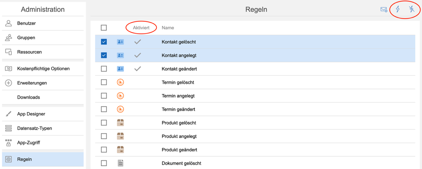 In der App Administration können Sie im Bereich Regeln die gewünschten Regeln aktivieren oder bei Bedarf deaktivieren.